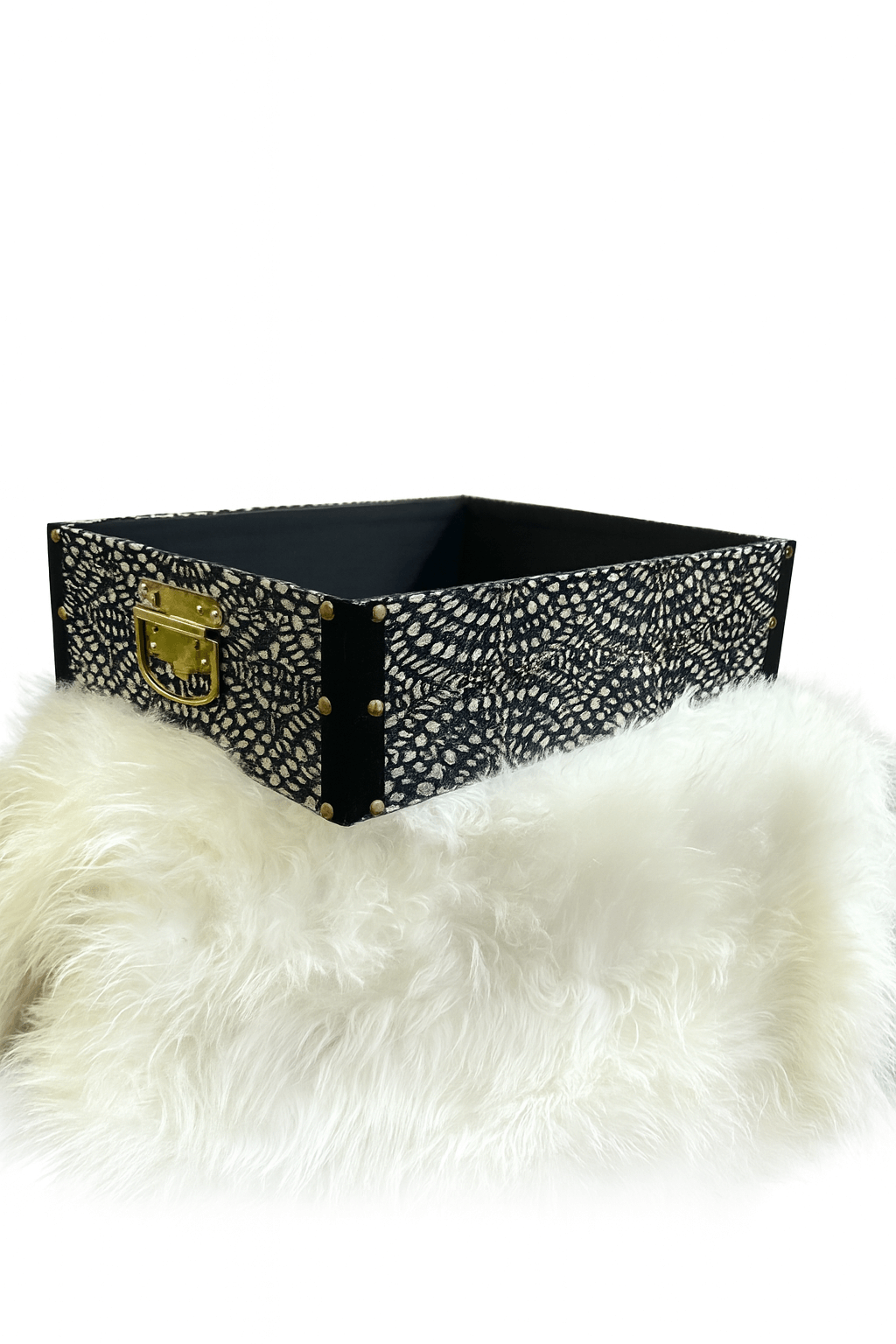 Sophisticated and bold, this black patterned gift tray is the perfect choice for luxury hampers and elegant gifting. Wrapped in a striking black fabric with intricate white leaf-like motifs, it combines artistry with modern style.