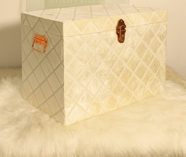 Elevate your gifting experience with this premium rectangular gift box, crafted from a rich, textured fabric in cool Cream tones. Designed with elegance and durability in mind, it features gleaming rose-gold corner protectors and a secure latch closure, ensuring your gifts are both beautifully presented and well-protected. Perfect for hampers, keepsakes, or special occasion packaging, this box transforms any gift into a statement of style and sophistication.
