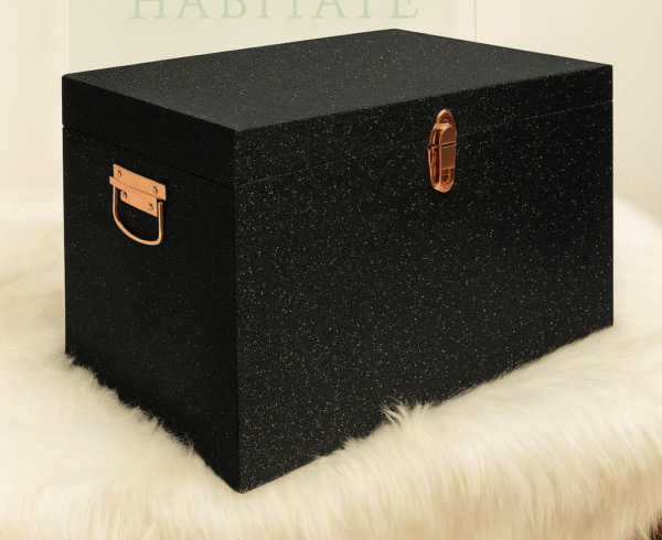 Elevate your gifting experience with this premium rectangular gift box, crafted from a rich, textured fabric in glittering black tones. Designed with elegance and durability in mind, it features gleaming rose-gold corner protectors and a secure latch closure, ensuring your gifts are both beautifully presented and well-protected. Perfect for hampers, keepsakes, or special occasion packaging, this box transforms any gift into a statement of style and sophistication.