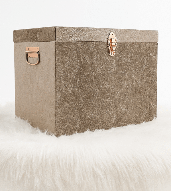 Elevate your gifting experience with this premium rectangular gift box, crafted from a rich, textured fabric in cool grey tones. Designed with elegance and durability in mind, it features gleaming rose-gold corner protectors and a secure latch closure, ensuring your gifts are both beautifully presented and well-protected. Perfect for hampers, keepsakes, or special occasion packaging, this box transforms any gift into a statement of style and sophistication.